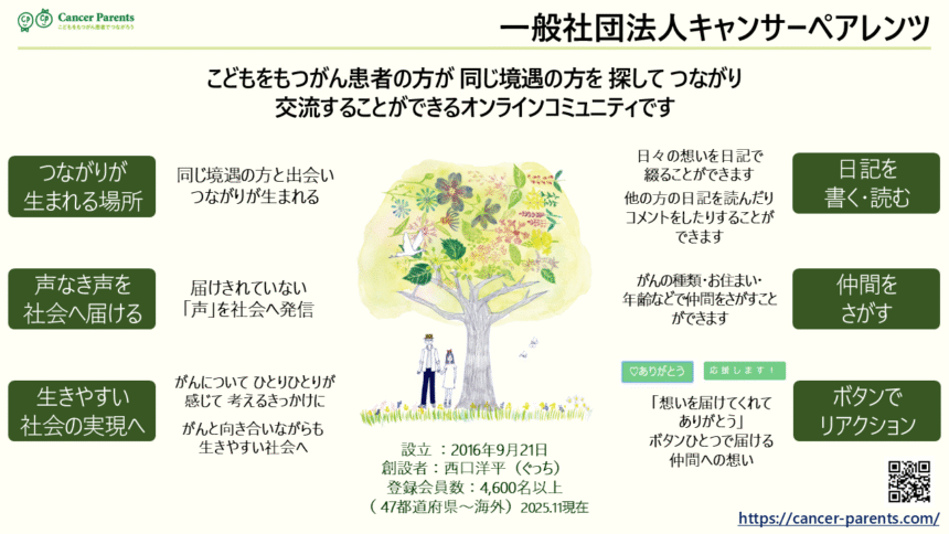創設者の西口洋平さんが、自身のがんと向き合う中で「孤独や不安を感じているのは自分だけではないはず」と2016年に立ち上げました。